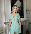 A knit mini dress that fits like a glove. This dress is from the luxe range and has an expensive finish. Featuring a stunning knit like fabric with sequins and sparkles to make you look 1 million dollars. The dress has a hourglass like finish with a flare skirt and can be worn with the buttons open slightly or fully closed.