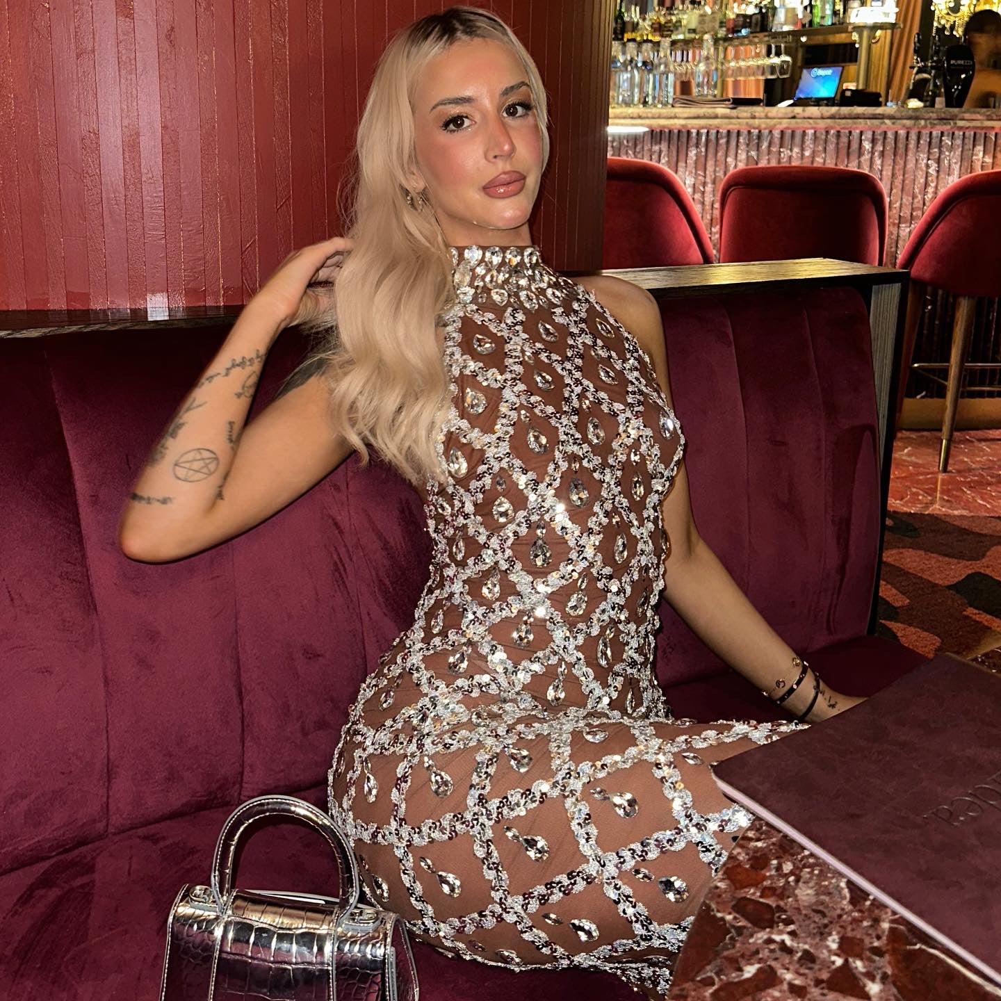 Turn heads in this stunning halter dress featuring jewels and sequins head to toe. This glamorous dress will have you looking and feeling 1 million dollars. A back split and high neck design creates a expensive feel. This is from the luxe collection.