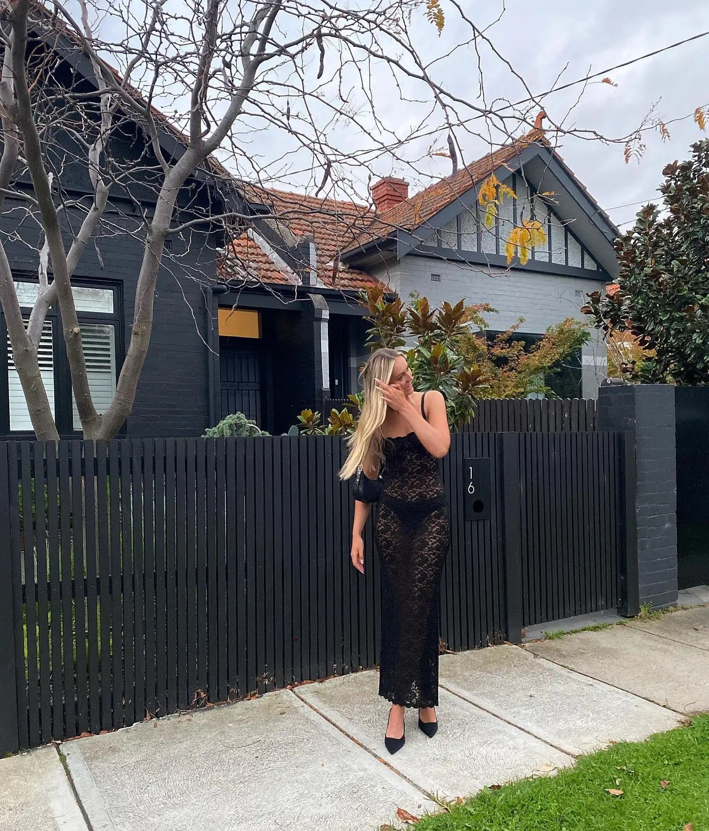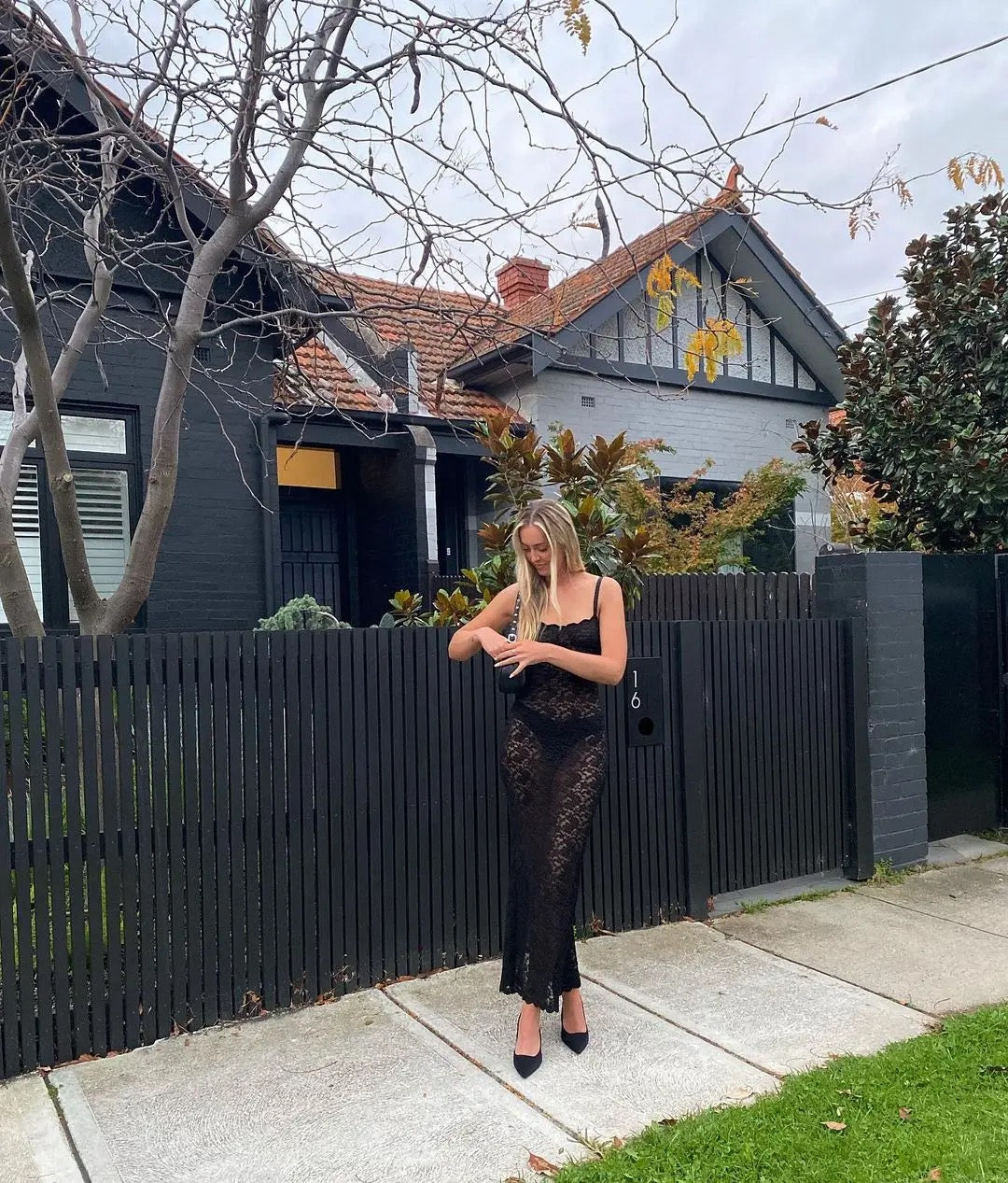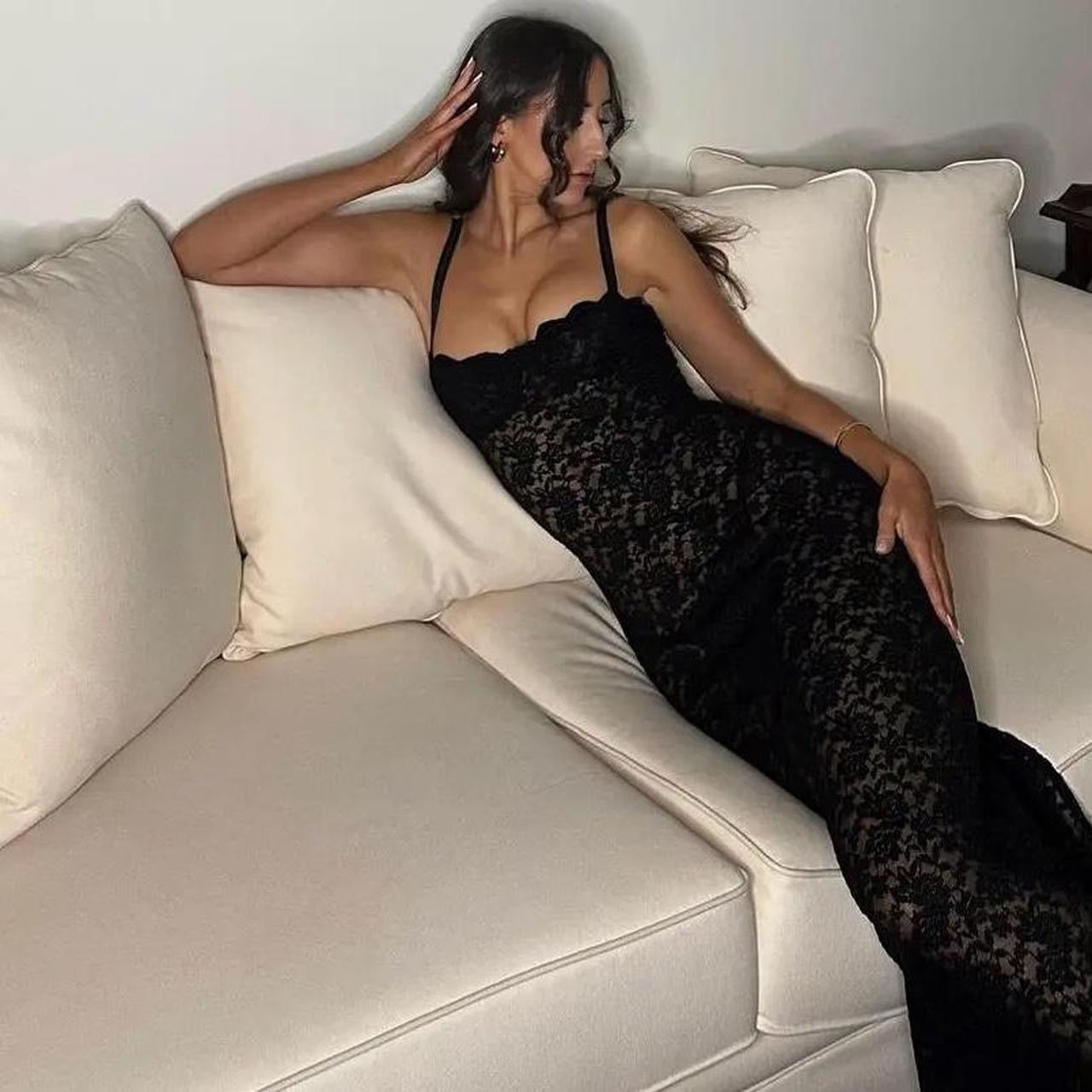 A stunning black lace dress. Team up with a black bra and underwear. It is a see through piece but is such a classic piece