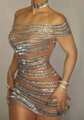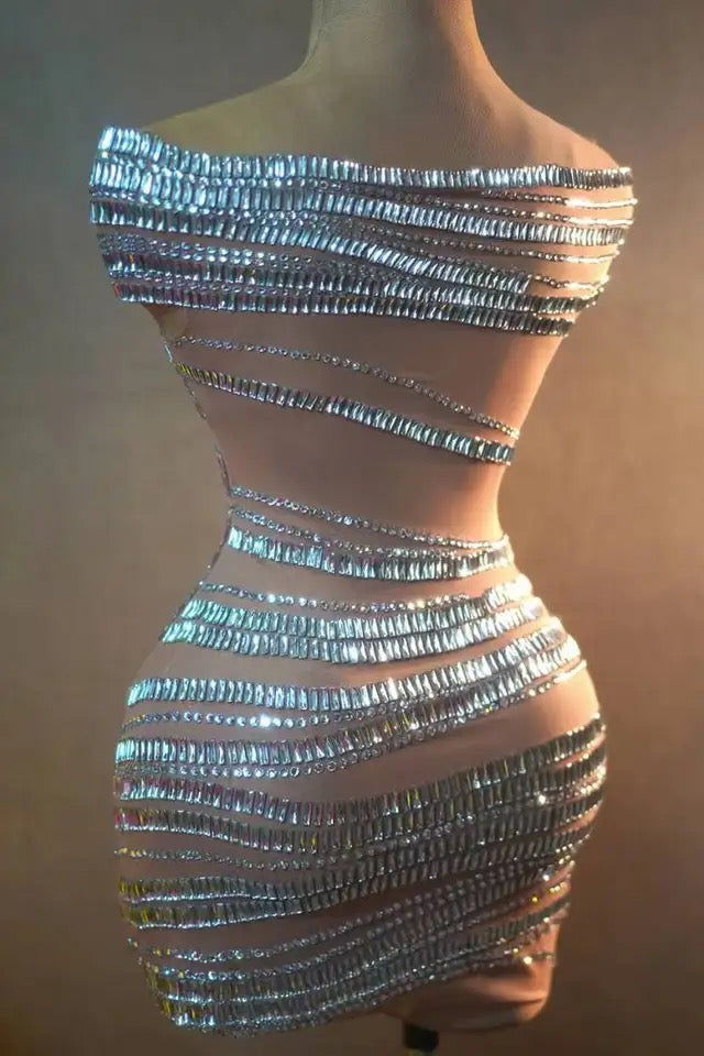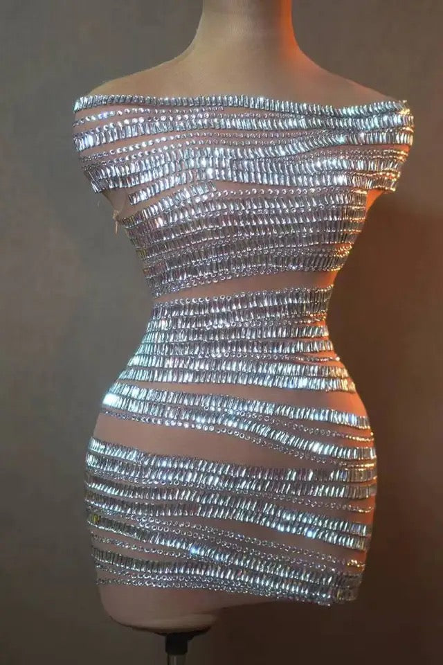 A stunning off the shoulder, minidress fully mesh lined and complete with hand glued rhinestone embellishments. The Dress is a stretchy fabric which creates the most amazing finger on your body and accentuates all your curves. I must have party dress to show up for your birthday or any event.